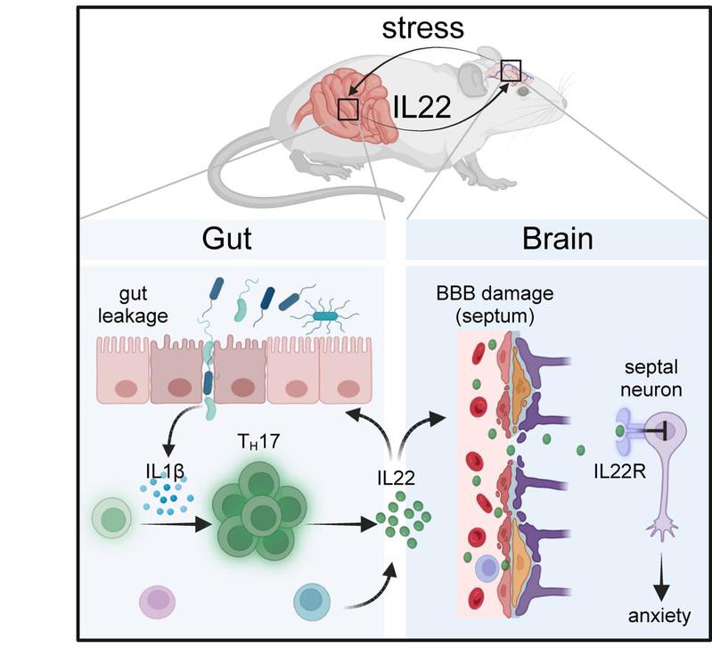 综上,该项研究阐述了在压力引起的免疫激活早期阶段,肠道TH17细胞增加并产生IL-22;IL-22可经破损的血脑屏障进入脑隔区直接抑制神经元激活,进而降低小鼠的压力应激性焦虑行为,从而揭示了压力应激诱导下的免疫激活早期阶段具有以前未被认识到的有益作用,可能是进化过程中机体保留应激性免疫系统激活的原因之一;同时也揭示了免疫系统在抵御精神疾病方面的积极作用。此外,该项工作也探究了IL-22对降低抑郁行为的效应,为利用IL-22治疗压力相关精神疾病提供新的思路。