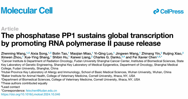 2024年11月26日,复旦大学生物医学研究院陈飞课题组在Molecular Cell杂志在线发表题为“The phosphatase PP1 sustains global transcription by promoting RNA polymerase II pause release”的研究论文。该研究揭示了PNUTS-PP1复合物在调控转录暂停中的关键作用和机制,并进一步探讨了两种高丰度磷酸酶PP1和PP2A在转录调控中截然不同的功能。