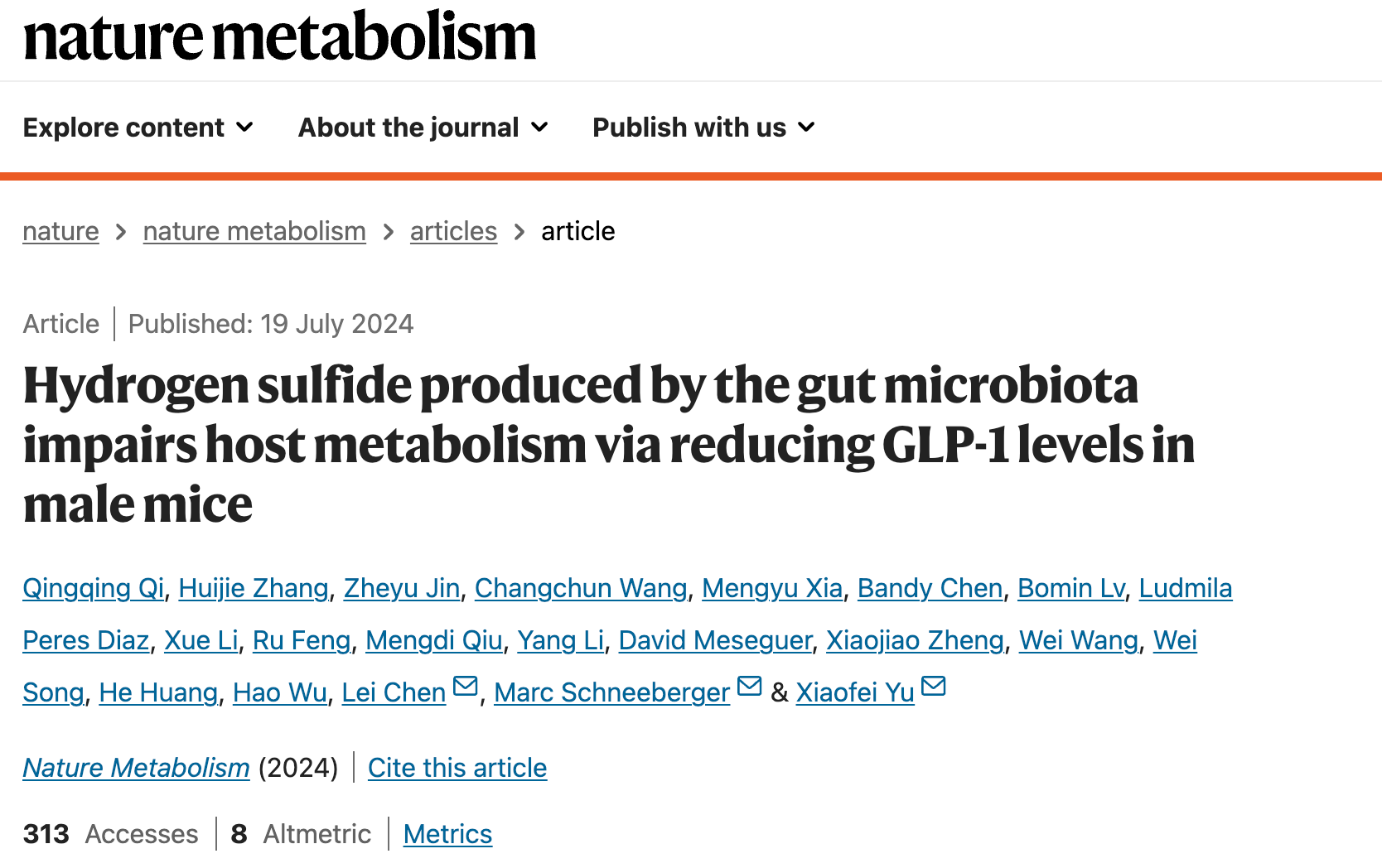 2024年07月19日,我室于肖飞团队在Nature Metabolism发表了题目为Hydrogen sulfide produced by the gut microbiota impairs host metabolism via reducing GLP-1 levels in male mice的文章,报道了以脱硫弧菌(Desulfovibrio)为代表的肠道菌可通过产生硫化氢抑制GLP-1的产生,并促进肥胖等代谢疾病的发生,从而揭示了肠道菌通过肠道“中继”影响机体代谢的新通路。由肠道菌群领域著名专家、美国RUTGERS大学赵立平教授撰写的评述文章“'H2S as a metabolic saboteur”也同期上线。
