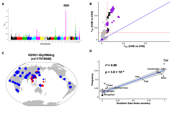 2024年7月16日,国际知名学术期刊 Molecular Biology and Evolution在线发表了我室徐书华团队题为“Adaptive evolution of two distinct adaptive haplotypes of Neanderthal origin at the immunoglobulin heavy-chain locus in East Asian and European populations”的研究论文。该研究深入分析了全球各地的现代人全基因组测序数据,在欧洲人群、东亚人群14号染色体14q32.33编码免疫球蛋白重链恒定区域内分别发现一种受正向自然选择的独特单倍型。该研究进一步构建了欧亚人群中不同适应性单倍型的演化模型,并探讨了这些单倍型对现代人疫苗接种效果以及免疫类疾病易感性的潜在影响。该项工作阐明了免疫球蛋白重链恒定区的适应性演化以及趋同演化机制,不仅为理解人类免疫系统的多样性和复杂性提供了新的视角,而且为进一步研究不同族群个体的免疫反应差异提供了群体遗传和进化生物学线索和理论指导。