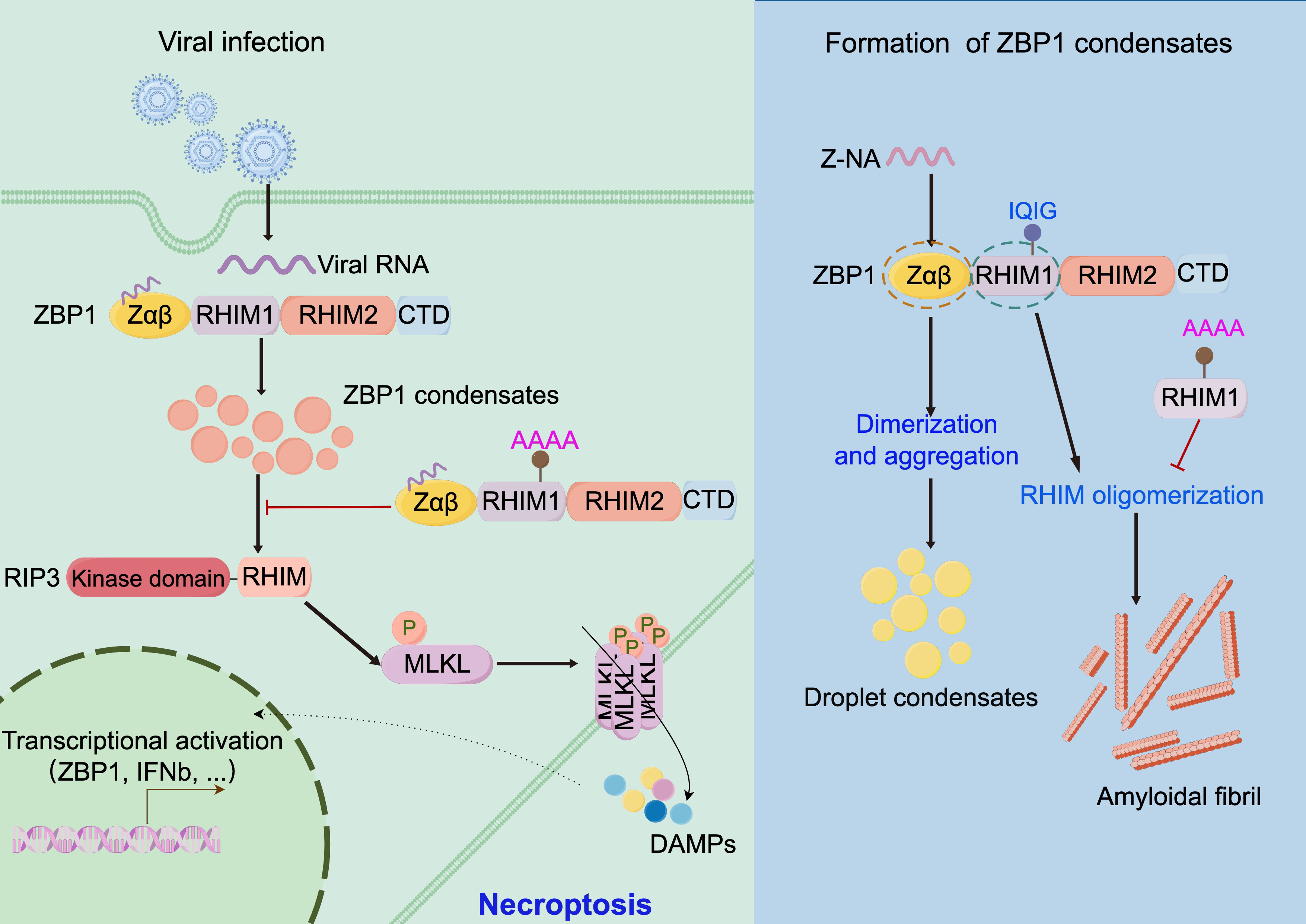 Z-DNA结合蛋白1(ZBP1或DAI)是第一个被发现存在于细胞质中的DNA感知蛋白受体。作为固有免疫应答过程中的关键基因,ZBP1通过Zαβ结构域感知Z型核酸刺激,依赖RHIM结构域与RIPK1、RIPK3、TRIF等蛋白结合,参与泛死亡小体(PANoptosome)组装,诱导细胞程序性死亡来抵抗病原体侵染。研究也表明ZBP1与热射病、自身免疫疾病、肠炎、癌症等多种疾病密切相关。