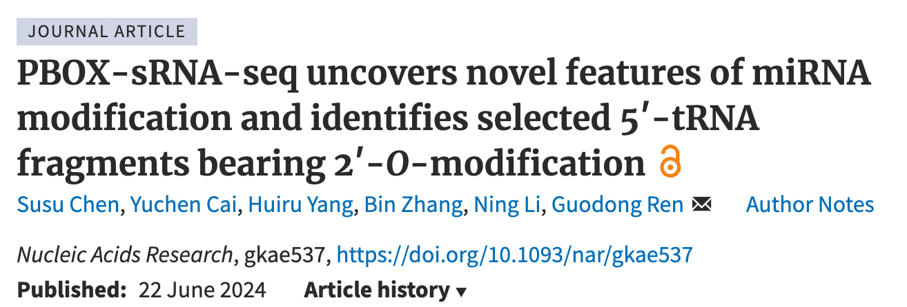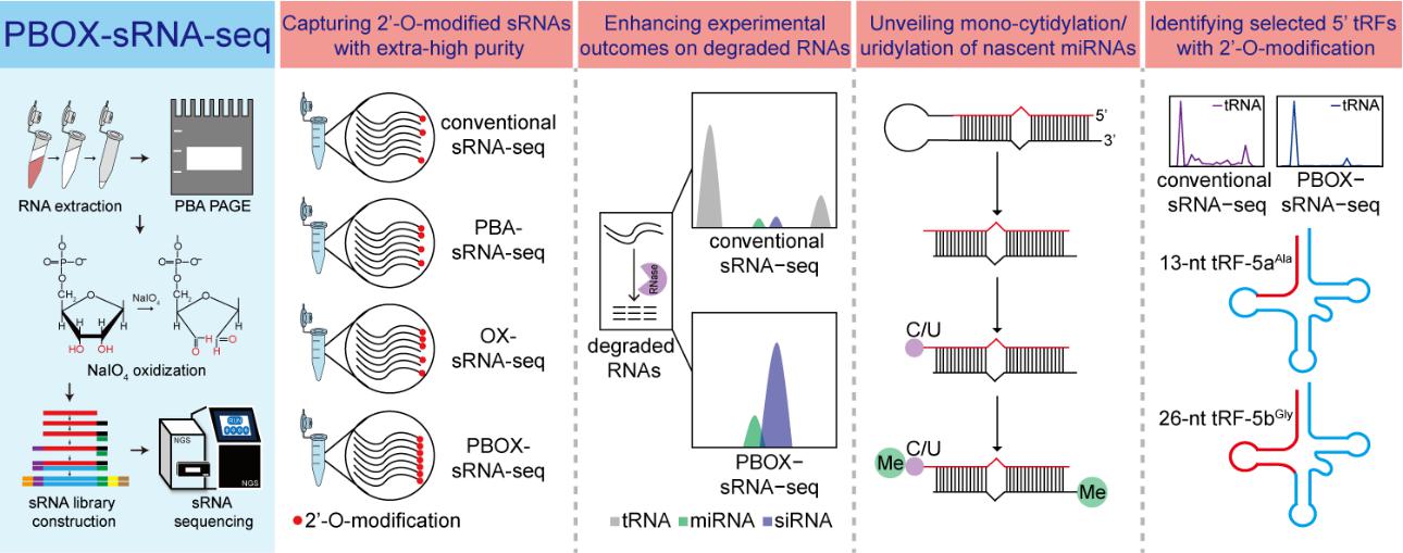 近日,我室任国栋课题组在Nucleic Acids Research杂志在线发表了题为“PBOX-sRNA-seq uncovers novel features of miRNA modification and identifies selected 5’-tRNA fragments bearing 2’-O-modification”的研究论文。该论文借助hen1-2弱突变体同时含有甲基化sRNA及非甲基化sRNA(可通过长度和非模板加尾进行区分)的特点,系统评估了PBA变性凝胶电泳分离(PBA-sRNA-seq)、NaIO4处理(OX-sRNA-seq)以及联合处理(PBOX-sRNA-seq)测序方法对末端修饰小RNA测序的影响,发现PBOX-sRNA-seq具有最高的信噪比。