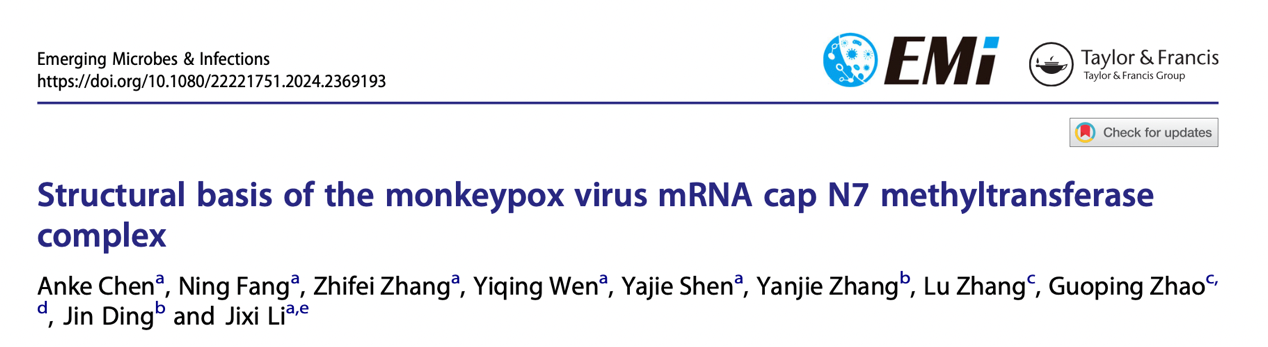 2024年6月,我室李继喜教授课题组和海军军医大学丁劲教授课题组合作在Emerg Microbes Infect杂志发表了题为Structural basis of the monkeypox virus mRNA cap N7 methyltransferase complex的研究论文。