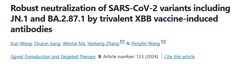 2024年5月9日,复旦大学生命科学学院王鹏飞联合南京市中医院于国际权威杂志Signal Transduction and Targeted Therapy在线发表题为“Robust neutralization of SARS-CoV-2 variants including JN.1 and BA.2.87.1 by trivalent XBB vaccine-induced antibodies”的论文,研究显示威斯克3价XBB疫苗针对多种新冠变异株比XBB突破感染者诱导了更强的中和抗体反应,可有效对抗广泛的新冠病毒变异株。