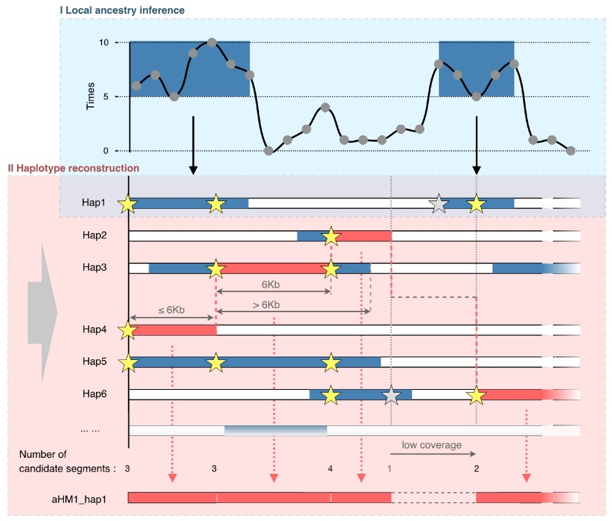 值得注意的是,在这项研究中研究团队开发出了基于现代人群基因组重构祖先基因组的新方法(图 2),并重构了苗瑶人群的祖先基因组。遗传学研究中对古人群的研究依赖古DNA样本,但古DNA样本获取困难、样本量小、族群归属不明、数据质量参差不齐的缺陷限制了古人群的深入研究,而该研究发展的新方法通过局部祖源推断从现代苗族、瑶族、畲族人群的基因组中标记并提取苗瑶人群的共祖序列片段,,进而通过片段拼接形成完整基因组。该方法在片段组装时着重考虑并结合了近期的序列连锁关系,同时对基因组上的祖源片段低覆盖区域进行了质控。基于该方法产生的古人群数据具有样本规模大、基因组覆盖度高、适用范围广等优点,有望促进古人群基因组及遗传学的深入研究。在与现代人群的整合分析中,重构的苗瑶祖先基因组表现出鲜明的苗瑶遗传特征,并作为一种东亚人群底层遗传祖源,在东亚特别是东亚南部人群中普遍存在。在自然选择信号的识别中,采用重构的苗瑶祖先基因组能在一定程度上抹除近期人群混合或其他混杂因素对选择信号的掩盖,其与传统检测方法联用,可显著提高自然选择信号的检出效力。因此,该方法为揭示群体遗传结构、推断族群演化遗传历史、检测自然选择信号等方面提供了技术支撑。