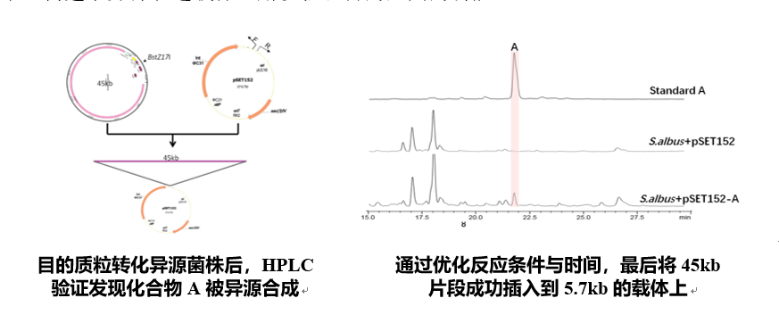 来自上海交通大学的步绪亮获得一等奖,他使用重组克隆试剂NovoRec® Cloning Kit将包含合成化合物A完整基因簇的45.5kb的目的片段插入到5.7kb的pSET载体中,构建了异源表达载体,用以验证目的基因的功能。