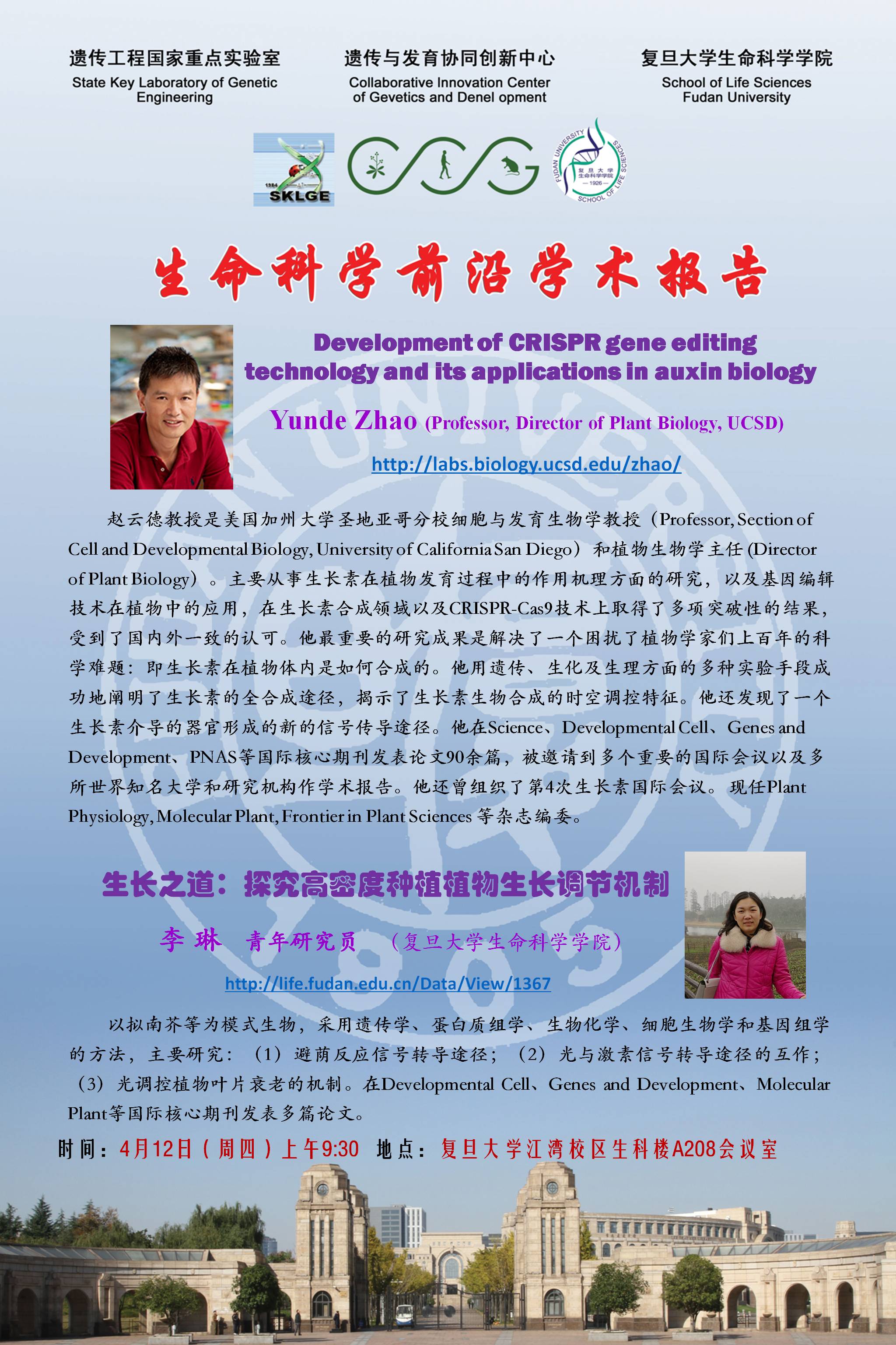 生命科学学术前沿讲坛报告20180412:赵云德教授(美国加州大学圣地亚哥分校)& 李琳 青年研究员(复旦大学生科院)