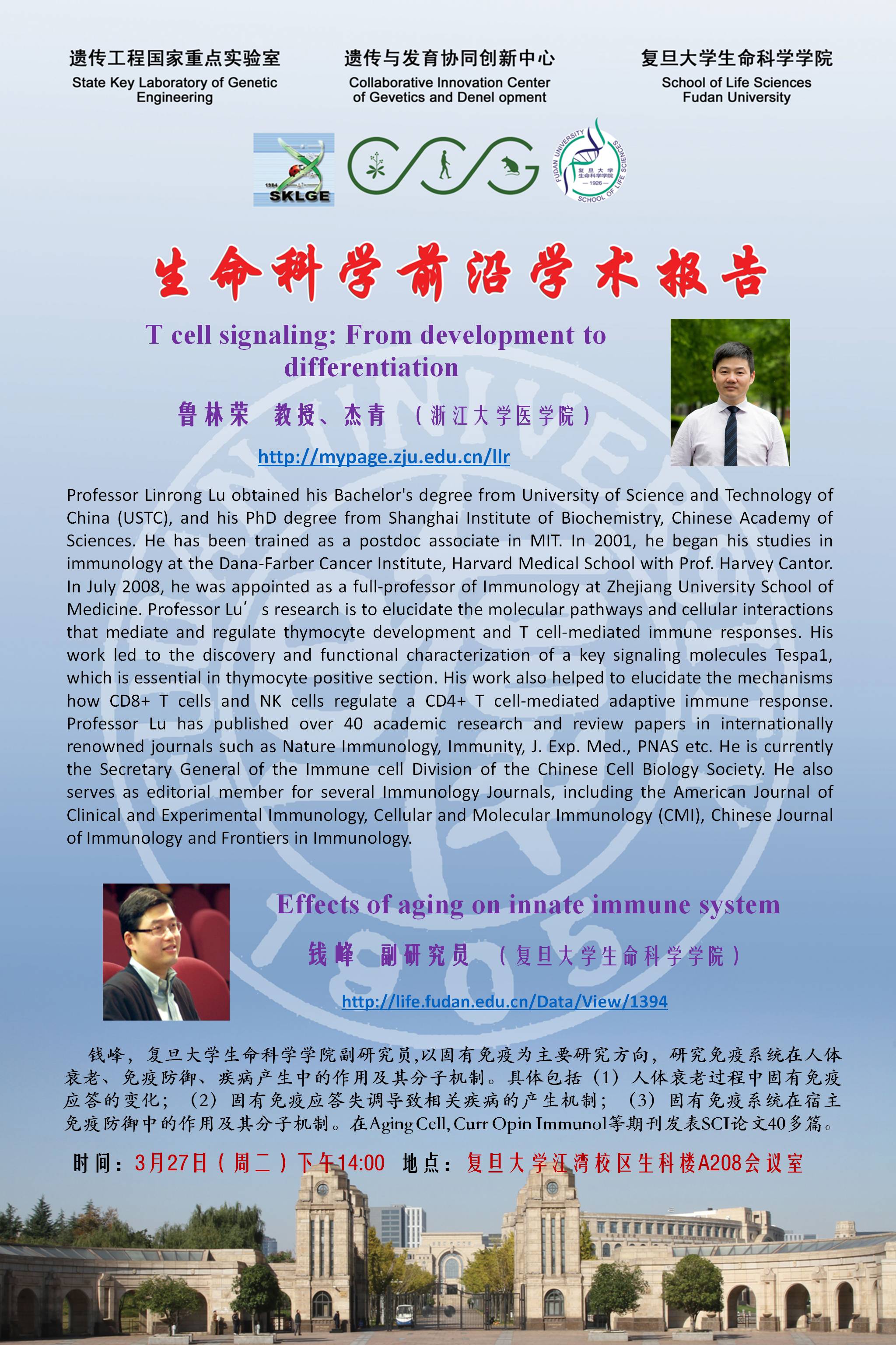 生命科学学术前沿讲坛报告20180327:鲁林荣教授(浙江大学医学院)& 钱峰副研究员(复旦大学生科院)