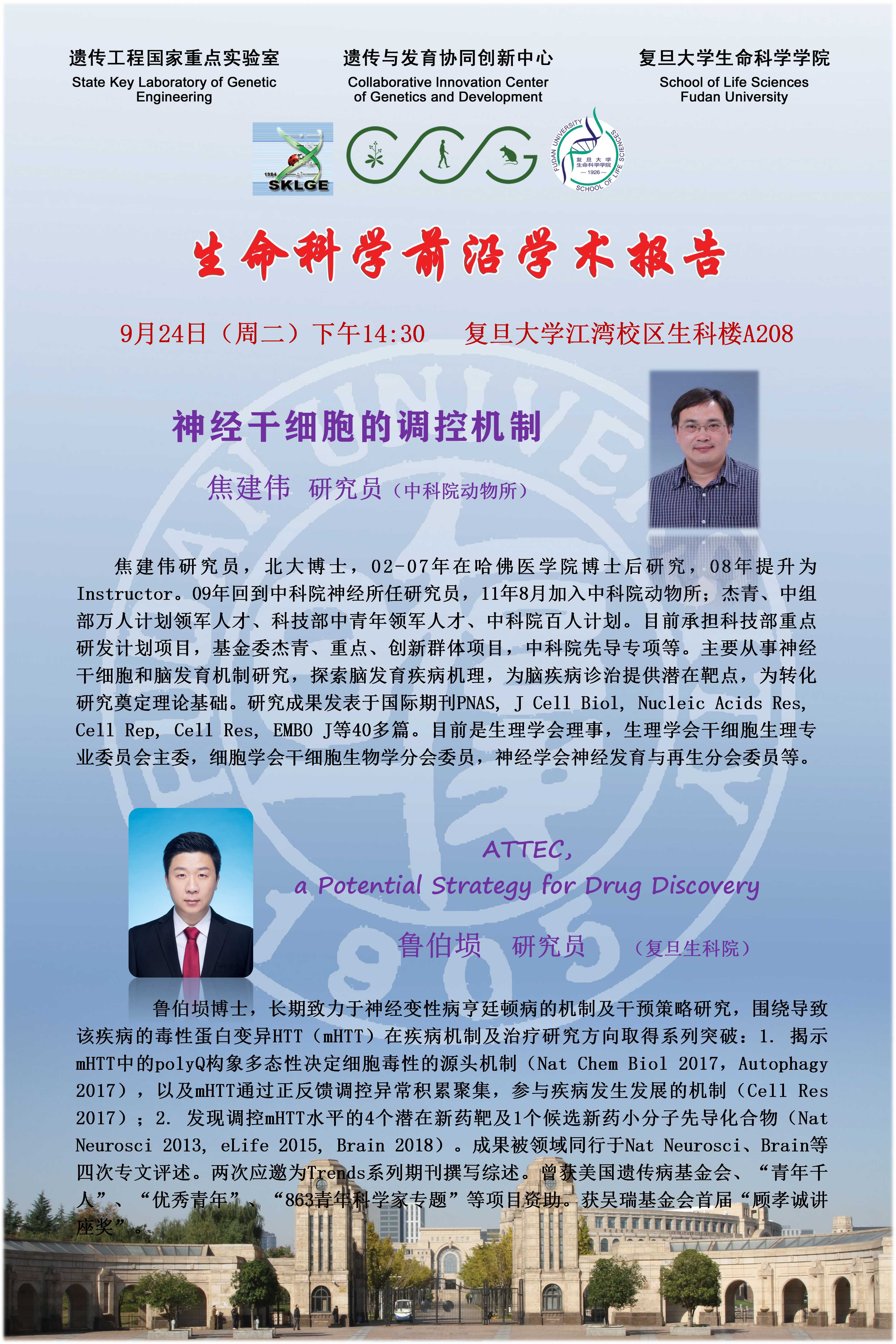 生命科学学术前沿讲坛【118】焦建伟研究员(中科院动物所)、鲁伯埙研究员(复旦生科院)
