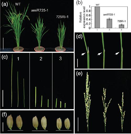 文章发现水稻SDG725具有H3K36专一性的甲基转移酶活性。sdg725突变体表型多效,主要表现为植株矮小、剑叶夹角和种子变小等油菜素内酯(BR)缺乏的典型特征。在sdg725中,大量与植物生长发育相关的基因在转录水平上发生改变,其中包括BR合成途径及信号传导途径的基因D11、BRI1和BU1。ChIP实验表明:sdg725中,D11、BRI1和BU1基因上的H3K36的双甲基化和三甲基化程度下降,同时SDG725蛋白在这些基因上的结合也明显减少,表明SDG725可以通过结合特定靶基因并对其进行组蛋白H3K36甲基化,进而促进目的基因的表达来影响水稻的生长发育。