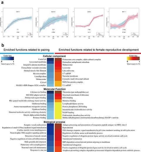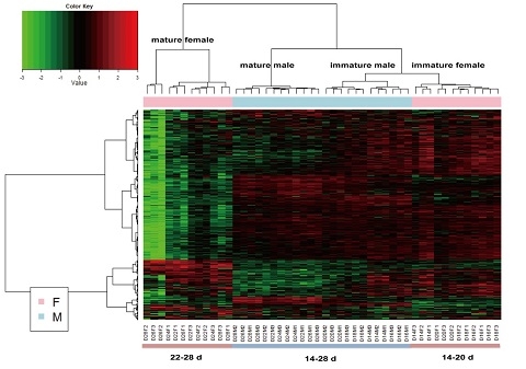 胡薇教授课题组通过RNA测序技术分别获取了日本血吸虫雌虫和雄虫在性成熟过程中的不同时间点的基因表达谱,展示了4,561条新的血吸虫转录本。对该动态表达谱分析发现,日本血吸虫的雌虫和雄虫在合抱前与合抱早期基因表达谱非常相近,随后差异越来越大;在整个性成熟过程中,雌虫表达谱变化剧烈,无论是表达变化的基因数量还是变化程度均远远高于雄虫。而且,雌虫的表达基因在合抱后第4-6天之间,超过四分之三的基因表达下调。具体的功能分析显示,雌雄虫持续高表达基因及发育过程中上、下调的基因功能显示,两种性别的血吸虫功能分化明显:雌虫合抱后一直朝生殖器官发育及具备强大产卵能力的方向特化,其他与运动、应激反应等能力退化,而这正好是雄虫在发育过程中逐渐强化的功能;说明雌雄虫的功能在成熟后期实现了完美的互补,俨然发展为一个紧密依存的“产卵共生体”,即:雌虫成为产卵机器,雄虫则努力让自己变得更“强壮”,为雌虫产卵提供庇护。基因表达模式分析还显示,性成熟过程丰富的基因表达谱变化模式,提示其具有复杂的调控机制。根据发掘与雌虫卵黄腺发育程度和合抱比例一致的基因表达模式,发现了一批与其生殖发育高度相关基因,这些基因只有少数有明确的功能注释,大部分为新的血吸虫特异功能基因,是潜在抗血吸虫药物和疫苗新靶点。