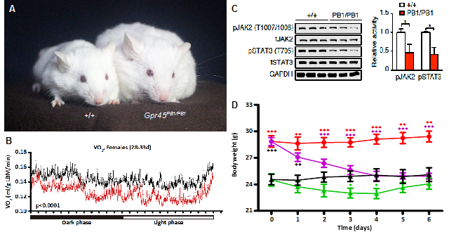吴晓晖教授课题组对新发现的G蛋白偶联受体Gpr45基因进行了深入研究,发现神经系统特异表达的Gpr45基因失活导致小鼠代谢减缓,自离乳起肥胖,进而出现脂肪肝、胰岛素抵抗、血糖增高等代谢异常。GPR45在下丘脑通过JAK/STAT信号通路调控能量代谢信号分子POMC的表达,Gpr45突变导致POMC表达量和POMC神经元活性降低,脑室注射POMC产物类似物MTII则可抑制Gpr45突变小鼠的肥胖(图2)