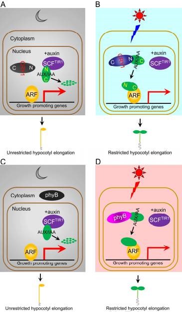 本研究表明,AUX/IAA通过与光受体和生长素受体互作整合了光信号和生长素信号,使光信号和生长素信号处于一定的平衡状态调控植物的形态建成。