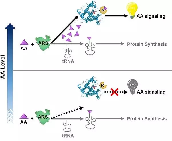 研究还发现,修饰到底物蛋白质赖氨酸上的氨基酸至少可以被包括去乙酰化酶在内的去修饰酶移除(SIRT1和SIRT3有此酶活)。因此,氨基酸修饰是动态可逆的蛋白质翻译后修饰。被氨基酸修饰后的蛋白质发生功能改变,比如,亮氨酸可以通过亮氨酸tRNA合成酶(LARS)修饰mTOR复合体的蛋白RagA,在亮氨酸浓度升高的时候激活mTOR;而谷氨酰胺可以通过谷氨酰胺tRNA合成酶(QARS)修饰并失活调控细胞凋亡的蛋白ASK1,在谷氨酰胺浓度升高的时候抑制细胞凋亡。