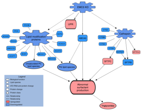 该模型建立在转录组测序分析与蛋白质组学分析的基础上。条件性敲除Emc3破坏了AT2细胞中表面活性物质的正常合成,而Emc3缺失引起的呼吸衰竭可能通过直接和间接的过程反映了EMC3对表面活性物质合成的复合作用。