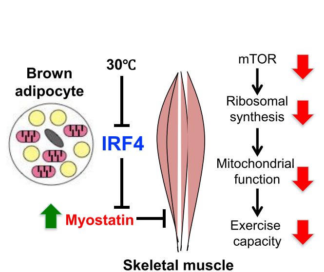 研究人员提取小鼠股外侧肌线粒体做进一步研究发现,运动功能受损的BATI4KO小鼠其线粒体功能、核糖体蛋白合成和肌肉mTOR信号传导均受抑制。RNA-seq表明棕色脂肪中IRF4的缺失会促进其肌源性基因特征性表达,其中包括分泌因子肌肉生长抑制素(肌抑素是一种明确的肌肉功能抑制剂)。分离小鼠BAT与C2C12体外共培养得到与体内试验一致的结果。将中和性抗体或可溶性ActRIIB受体注入BATI4KO小鼠可降低肌抑素活性并使其运动能力恢复正常。而IRF4在BAT中的过度表达(BATI4OE)则降低了血清中的肌抑素水平,增加了肌肉的线粒体功能和运动能力。为使研究结果置于生理背景下,研究人员将野生型小鼠饲养温度提高至30℃,该条件大大降低了IRF4的表达,这种热中性饲养引起的异常表型与BATI4KO基本一致,表现为运动能力降低、血清肌抑素增加;而上述两种异常改变都可通过手术切除BAT纠正