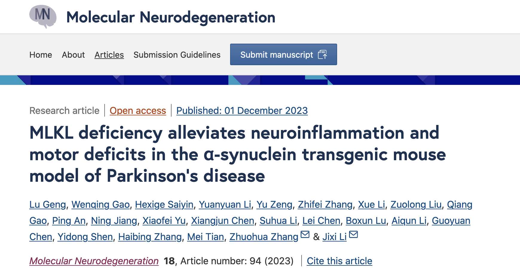 帕金森病是一种以多巴胺能神经元丧失和α-突触核蛋白(α-synuclein)聚集为特征的神经系统疾病,但目前缺乏有效治疗手段。我室李继喜教授、中南大学湘雅医院/南华大学张灼华教授合作在细胞程序性坏死调控帕金森病(PD)发生的机制方面取得重要进展,发现MLKL缺失可以显著缓解α-突触核蛋白突变导致的帕金森病模型小鼠的神经炎症和运动障碍症状。12月1日,研究论文以《MLKL deficiency alleviates neuroinflammation and motor deficits in the α-synuclein transgenic mouse model of Parkinson’s disease》为题在线发表在国际神经科学领域权威期刊《分子神经退行性疾病》(Molecular Neurodegeneration)(影响因子:15.1)杂志上。