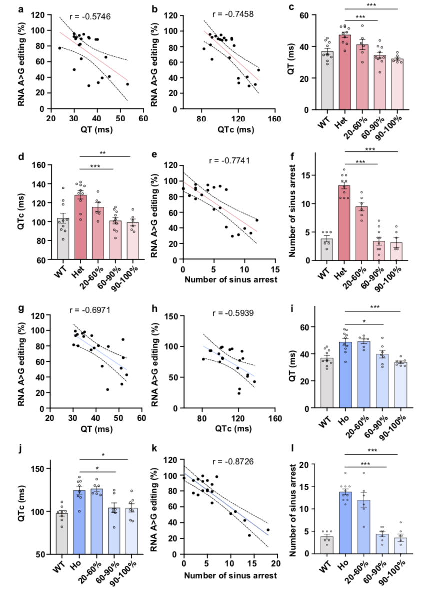 为了探究多高的编辑效率可以修复 LQT3 表型,研究者向新生14天的杂合小鼠腹腔注射AAV9-ABE病毒。10周后,观察到 T1307M mRNA 的修正率从 23.29% 到 95.72% 不等。将mRNA修正率与 QT间期以及窦性停搏次数关联。结果显示随着修正率的增加,QT间期逐渐缩短,卡巴胆碱诱导的窦性停搏次数逐渐下降(图3),说明即使较低的编辑效率,也能减轻长QT的表型。当mRNA 的修正率超过60%时,可完全消除杂合小鼠的心律失常表型。同时,在纯合T1307M小鼠中,碱基编辑还消除了致命性室性心动过速(图3)。这些结果表明编辑效率达到一定的阈值时,可以完全消除心律失常表型。最后,研究者对碱基编辑的安全性进行了评估,未发现明显的DNA或RNA脱靶。碱基编辑也没有引发额外的心率失常。此研究为治疗其他类型的心律失常提供了新的思路。
