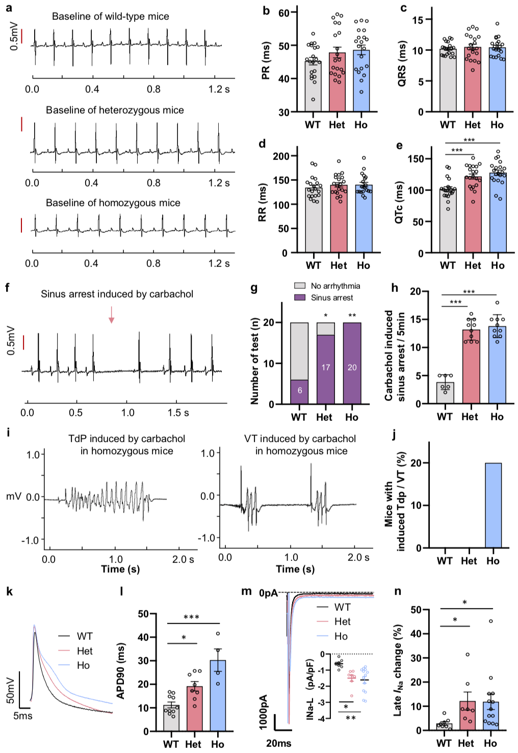 该研究首先将患者的致病突变T1307M引入到小鼠的Scn5a基因上,构建了LQT3小鼠模型。小鼠模型表现出LQT3患者典型的心电图特点,即QT延长(图1)。此外,在卡巴胆碱降低心率后,小鼠模型心脏窦性停搏增加;同时卡巴胆碱可诱导纯合小鼠模型产生室性心动过速。以上结果说明模型构建成功。