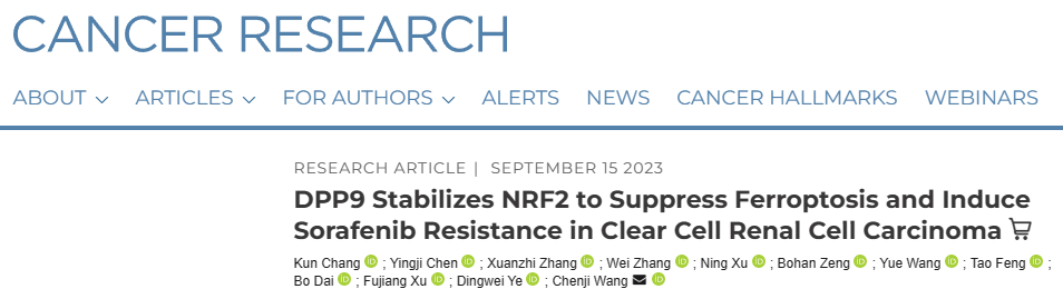 2023年9月15日,我室王陈继团队、复旦大学附属肿瘤医院叶定伟、戴波团队和西南医科大学附属医院徐富江团队合作在Cancer Research在线发表了题为DPP9 Stabilizes NRF2 to Suppress Ferroptosis and Induce Sorafenib Resistance in Clear Cell Renal Cell Carcinoma的研究论文。该研究发现揭示DPP9通过竞争性结合KEAP1,稳定NRF2蛋白水平,激活氧化应激信号,抑制细胞铁死亡,从而诱导了ccRCC靶向治疗耐药。