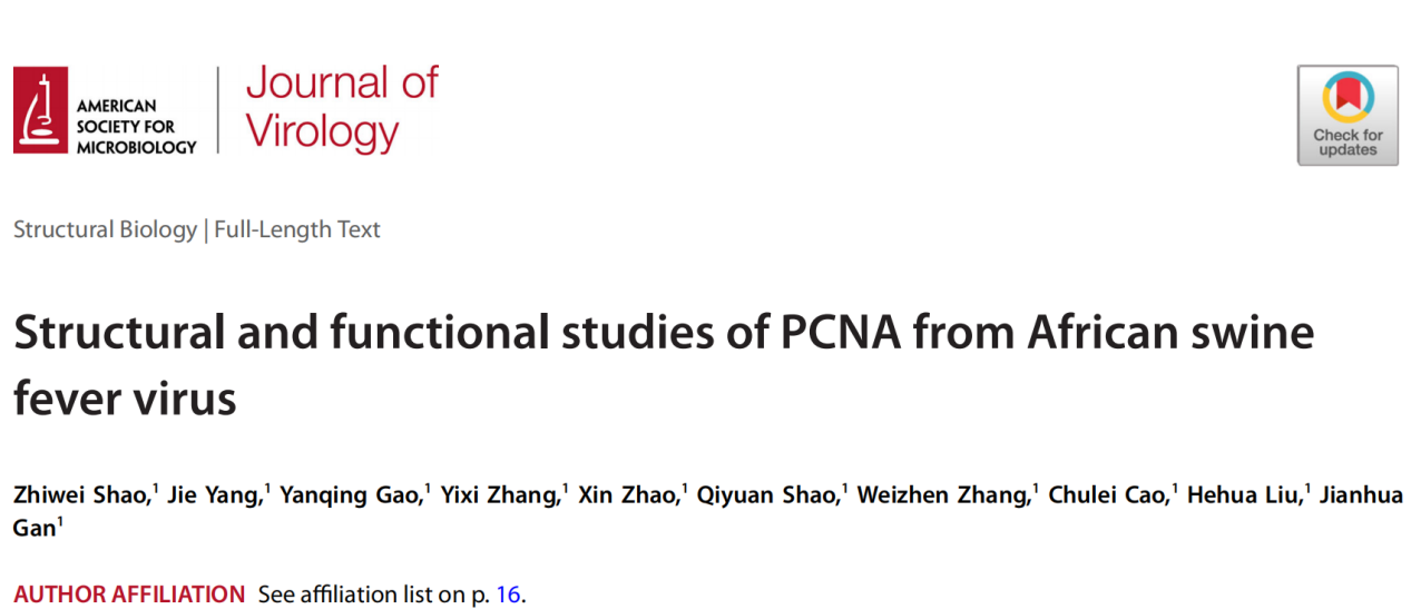 除了C962R蛋白外,ASFV的复制通路还包括了DNA聚合酶、拓扑异构酶、dUTPase以及PCNA等蛋白。PCNA在生物体中高度保守,尽管不具有催化功能,PCNA可以通过与其他蛋白互作,提高互作蛋白的催化效率,在DNA复制、修复以及其他DNA相关的通路中发挥了重要的调控作用。AsfvPCNA与同源蛋白的序列相似性非常低,其具体的结构和功能还没有得到充分的验证。为了全面了解ASFV DNA复制的过程,甘建华课题组同样对AsfvPCNA展开了研究,相关的结果于2023年8月3日发表在Journal of Viology杂志上,题为 “Structural and functional studies of PCNA from African swine fever virus”.