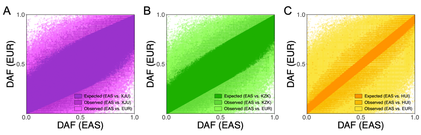 图2. 维吾尔族(XJU)、哈萨克(KZK)和回族(HUI)人群混合后的全基因组等位基因频谱