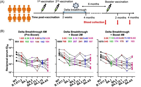 2023年2月1日,我室王鹏飞青年研究员课题组团队在Journal of Medical Virology发表了题为Limited enhancement of antibody and B-cell responses to prototype booster vaccination following SARS-CoV-2 Delta breakthrough infection的研究论文。作者收集了上一轮经历过Delta的感染者康复后及再接种加强针后的血清,评估了这些个体对不同OmicronBA.1, BA.2, BA.2.12.1, BA.2.75,和BA.4/5变异株的中和活性及B细胞免疫应答。作者发现对既往Delta康复者接种加强针后,相比于接种前,所有变异株中和抗体活性在第二个月时略有提高,在第四个月时没有显著变化。此外,作者还发现针对WT或BA.4/5 的RBD的特异性记忆B细胞的比例在加强针接种前后没有显著差异。总之,该研究发现新冠Delta突破性感染后,中和抗体和B细胞对原型加强疫苗的反应增强有限。该研究对于真实世界中接种策略调整和今后的疫苗设计方向具有重要的参考意义。