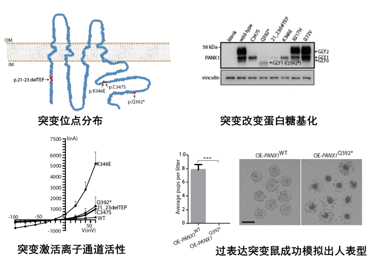 研究首先发现了一种此前从未被报道过的,导致女性不孕及试管婴儿反复失败的全新临床表型:某些患者卵子取出体外放置一段时间或受精后一段时间,出现退化凋亡的现象,将其命名为“卵子死亡”。在四个独立家系中,发现了PANX1存在不同的突变, 明确了此表型符合孟德尔显性遗传特点,证明了卵子死亡是一种全新的孟德尔显性遗传。PANX1为糖基化蛋白,随后在细胞及卵子中的系列功能实验证明:突变会改变PANX1的糖基化模式,被改变的糖基化模式与疾病密切相关,表明卵子死亡亦属于一种新的糖基化疾病。通过体外鼠卵子、爪蟾卵子研究显示:突变引起PANX1通道异常激活,加速了卵子内部ATP释放,导致疾病出现。有趣的是,四个PANX1 Knock-in突变鼠的生育力均正常且无明显表型。随后发现PANX1在人卵中的表达显著高于鼠卵,推测这可能是突变鼠无表型的原因。进一步制作了在卵子特异表达的野生型及突变型PANX1过表达鼠模型。鼠模型表现为不孕,且准确模拟出了卵子死亡的表型(图1)。此研究发现了人类新的孟德尔遗传病、糖基化疾病及离子通道疾病-卵子死亡;揭示了PANX1突变致疾病产生并明确了致病机制;同时也提供了首个深入研究PANX1病理学功能的鼠模型。