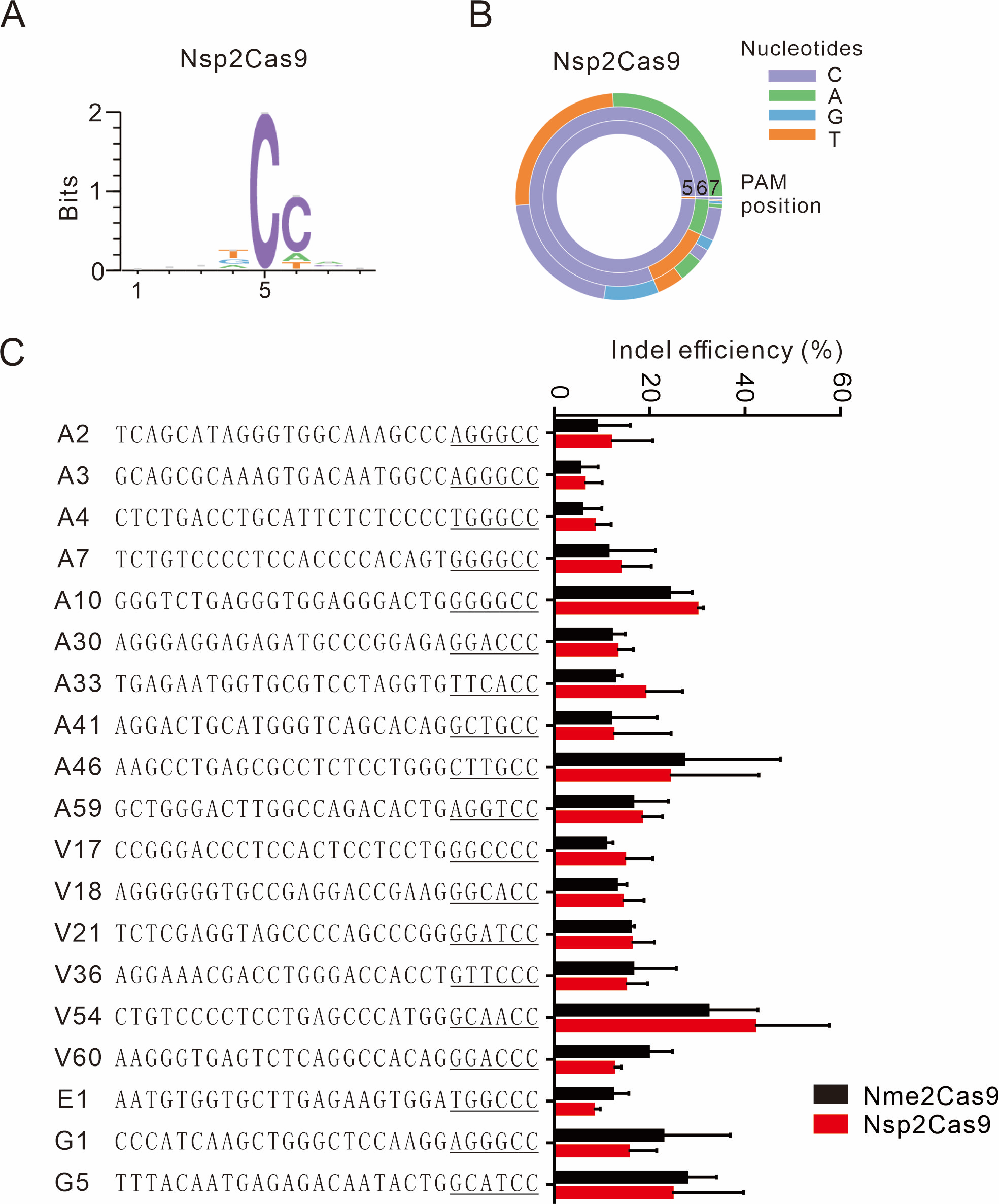 图3. Nsp2Cas9的PAM及编辑活性