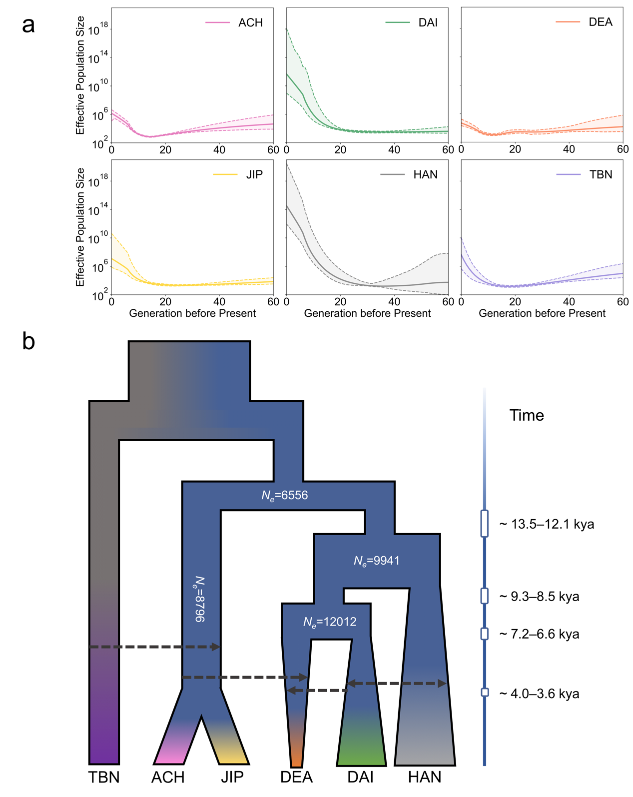 研究团队首先在东亚和东南亚参考族群背景下鉴定出四个滇西少数民族存在较大的遗传分化(图1),并重构了四个滇西少数民族的遗传历史(图2)。具体而言,阿昌族和景颇族相互之间遗传关系紧密,与其他高原少数民族以及藏缅族群有更近的遗传联系,并且存在来自高原少数民族的基因流;傣族与陆地东南亚各族群有较近的遗传联系,同时与周边的汉族以及其他族群存在更多的遗传交流,从而也表现出有效群体大小的持续扩张;德昂族与缅甸人关系较近,是四个少数民族中隔离程度最高的族群,呈现出四个族群中最小的有效群体大小,但仍存在来自百越和氐羌族群的基因流。该研究还进一步发现该遗传差异与各少数民族居住的海拔高度存在显著关联,表明云南复杂的地形地势很可能是造就居住在同一地区不同族群的遗传差异得以长期保持的关键因素。