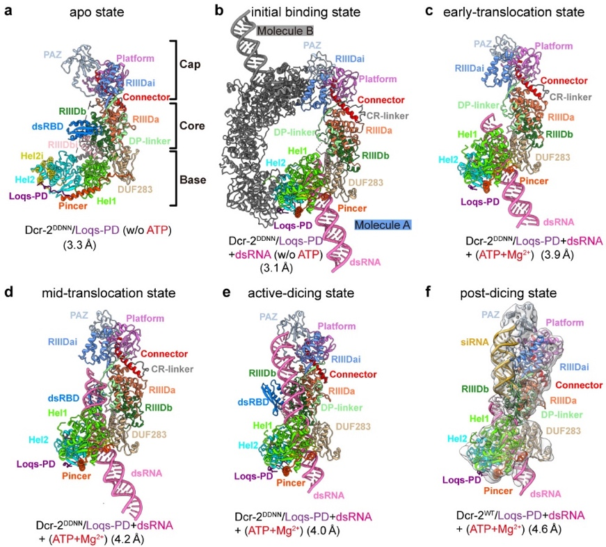 图1. Dicer-2–Loqs-PD结合双链RNA复合物在不同状态下的冷冻电镜结构。