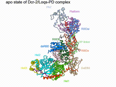 RNA干扰(RNAi)是许多真核生物中一种保守的RNA沉默机制, 小干扰RNA是RNA干扰的关键组成部分。在果蝇中,siRNA的产生是由Dicer-2(Dcr-2)蛋白在其辅因子Loqs-PD的辅助下,从长的双链RNA(dsRNA)上切割产生21个碱基对的双链siRNA。Dicer-2是最早被发现的ATP依赖型的Dicer家族蛋白,在2000年即发现siRNA加工生成过程是ATP依赖的。近年来,虽然有多篇关于Dicer家族蛋白的生化与结构研究的文章发表,但是对于ATP依赖型的Dicer蛋白识别并切割RNA底物的整个过程的分子机制仍不清楚。