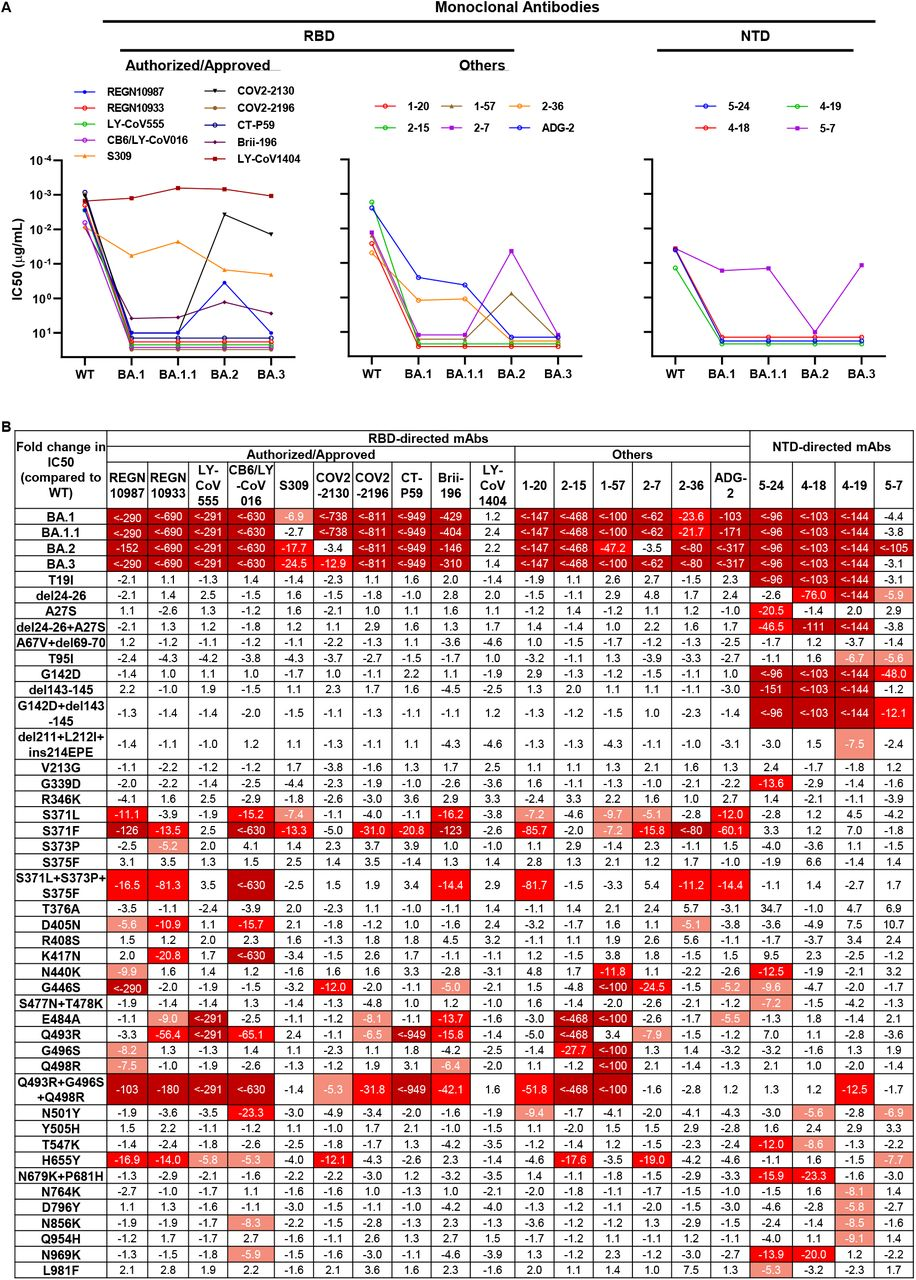 本项研究还通过单克隆抗体(mAbs)研究了Omicron亚谱系的免疫逃逸能力。与研究者对BA.1的报告类似,大多数mAbs对BA.1.1、BA.2和BA.3的中和活性完全或大幅度丧失。但研究者也观察到某些mAbs对于这些病毒呈现出不同的中和模式。例如,S309和5-7,是两个之前报道对BA.1基本保持活性的mAbs,但它们的活性被BA.2进一步逃逸。而另一些mAbs如COV2-2130和2-7对BA.1完全失去了活性,但对BA.2又恢复了活性。好消息是LY-CoV1404或bebtelovimab对所有Omicron亚系和其他主要的病毒变体都保持有效的中和活性。研究人员还构建了所以这些病毒携带的单点突变和某些突变组合,并全面地评价了20种mAbs对这些突变的中和能力研究,绘制了一张详细的抗体中和图谱。研究指出,尽管LY-CoV1404目前仍然是治疗性抗体的希望,但鉴于RNA病毒的易突变特性,如果将其作为单一疗法长期施用,仍可能会出现耐药性。因此,作者倡议开发更高效、广泛的中和抗体混合使用,以对抗不断变异的病毒。