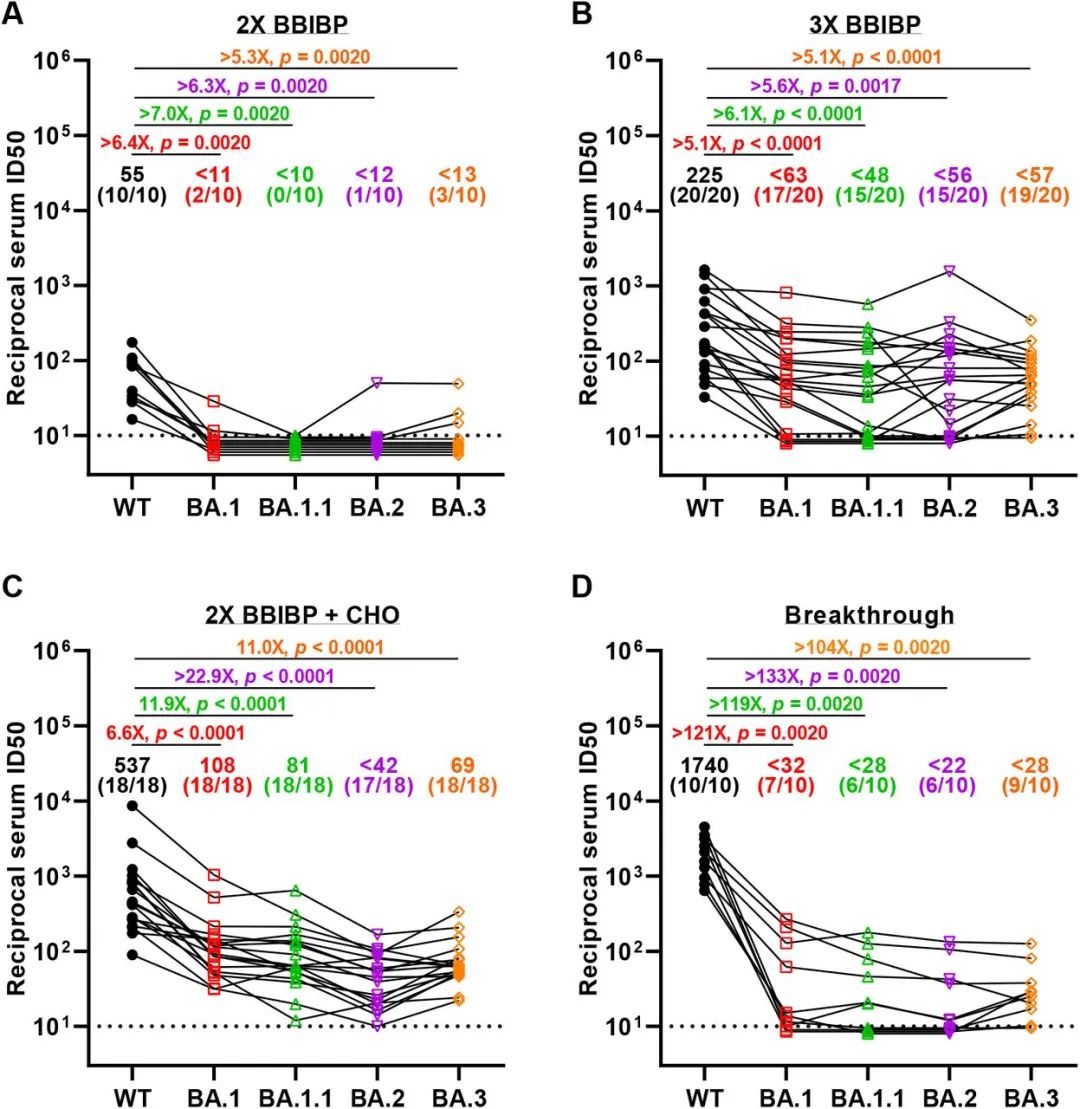 研究者之前就报道过康复者或BBIBP-CorV疫苗接种血清对BA.1的中和活性显著降低(Wang X et al. Emerg Microbes Infect. 2022)。在这里,研究者指出这些多克隆血清对其他Omicron亚谱系的中和活性下降幅度与BA.1相当甚至更大,表明所有这些亚谱系与WT病毒具有非常远的抗原距离。研究者认为BA.2相对于BA.1的选择性优势应该主要归因于其更高的传播性而不是免疫逃避。另一方面,研究者指出接种同源灭活疫苗加强针或异源蛋白质亚单位疫苗加强针可以显著提高Omicron的中和滴度。最近报道的一些新冠重组毒株(XD,XE和XF),因为它们的S蛋白与BA.1或BA.2相同,它们的抗体逃避应该与这里研究的Omicron亚谱系类似。因此,推广疫苗加强针注射仍然是预防新冠病毒传播的有效手段。