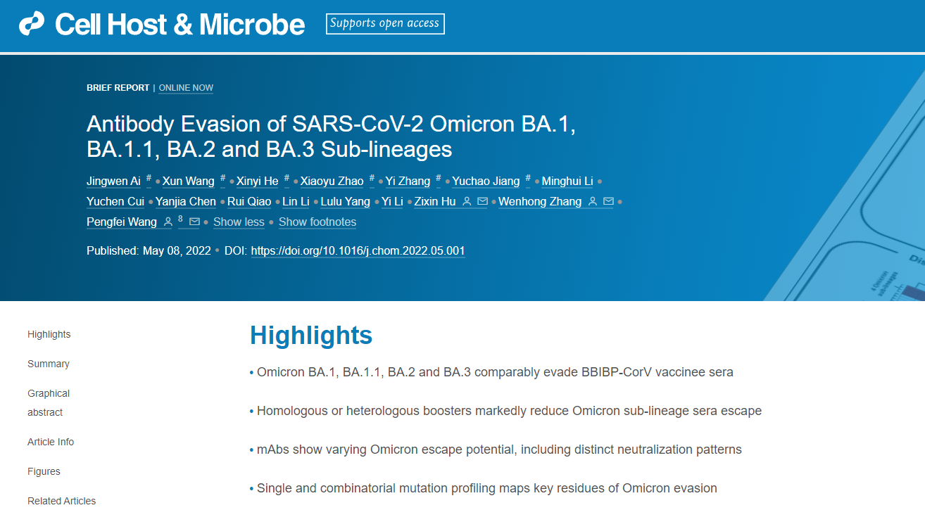 2022年5月8日,Cell Host & Microbe在线发表了我室王鹏飞、张文宏以及胡子欣团队题为:Antibody Evasion of SARS-CoV-2 Omicron BA.1, BA.1.1, BA.2 and BA.3 Sub-lineages的研究论文。该研究使用基于VSV的假病毒研究发现接种两剂灭活疫苗(BBIBP-CorV)的个体血清对于Omicron,显示出非常弱或几乎没有中和活性,而同源的灭活疫苗加强针或蛋白亚单位疫苗(ZF2001)的异源加强针则能显著改善针对所有Omicron变体的中和滴度。研究进一步评估了20个单克隆抗体的中和情况,其中包括10个已经授权或批准的。大多数单克隆抗体在Omicron亚谱系中完全或基本上失去了中和活性,仅个别单克隆抗体仍保留较好的中和效果。综上所述,所有四个Omicron亚谱系都威胁到当前疫苗和抗体疗法的有效性,突出了推广疫苗加强针对抗新冠新变体的重要性。