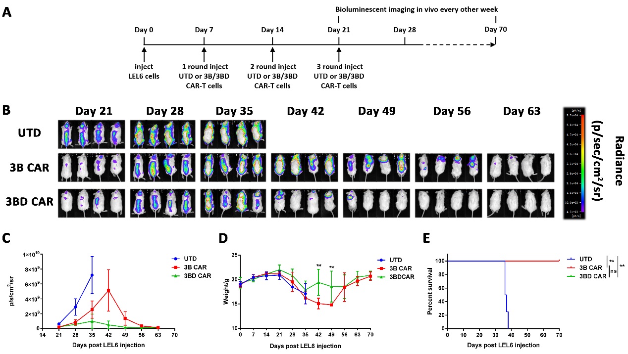 研究者针对HIV感染细胞特异性包膜蛋白GP120, 设计构建了广谱中和性抗体3BNC117的单链抗体 CAR载体(3BNC117-CAR, 3B-CAR);并将具有阻断PD-1/PD-L1信号通路的PD-1显性负性受体(PD-1 dominant negative Receptor,DNR)元件克隆到3B-CAR载体构成3BNC117-DNR CAR(3BD-CAR)。在体外HIV-1假型细胞模型、HIV-1感染细胞和HIV-1潜伏感染细胞等多个细胞模型上分别证实了DNR可以增强CAR T细胞的杀伤功能,以及更强的细胞因子分泌能力。在构建的移植HIV-1 env+/PD-L1+免疫细胞的 NCG小鼠模型上评估了抗HIV CAR-T细胞在体内的有效性和安全性。结果显示3BD- CAR组比3B- CAR组能够更快地实现对HIV-1 env+细胞的完全清除。另外,发现无论3B- CAR还是3BD- CAR组皆可以有效恢复小鼠体重,延长小鼠生存周期,并且未见明显组织病理学变化。上述结果提示了新型抗HIV CAR-T的有效性和安全性,将为CAR-T疗法功能性治愈艾滋病的临床应用奠定了基础。