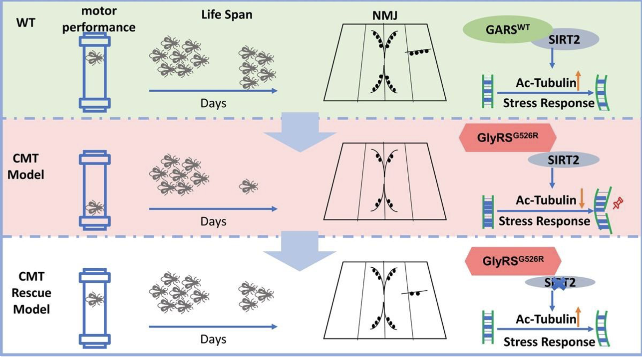 余巍课题组发现,野生型 GARS 可以结合去乙酰化酶 SIRT2,抑制其活性,维持了 SIRT2 的主要底物a-tubulin 的乙酰化。而 GARCMT 突变体显著降低了与 SIRT2 的结合, 导致乙酰化微管蛋白的显著下降,这可能是导致 CMT 等神经病变的原因。用 GARS 截断体和 SIRT2 进行互作分析,发现 GARS 的催化结构域与 SIRT2 相互作用,这是 CMT2D 最多的突变定位。这些结果提示,GARS 中 CMT2D 突变可能改变其结构构象,使 GARSCMT 失去与 SIRT2 的结合,减少对 SIRT2 酶活的抑制,从而显著降低乙酰化a-tubulin。进一步利用果蝇作为模式生物,敲低 SIRT2 能显著拯救 GARSCMT 运动方面的表型,并延长 GARSCMT 果蝇的寿命;而用 SIRT2 特异性抑制剂处理 GARSCMT 果蝇,也能拯救 GARSCMT 果蝇运动性能的缺陷和寿命。本研究提供了一种潜在的靶向 SIRT2 而拯救 GARS 突变导致腓骨肌萎缩症的方法, 为治疗遗传性外周神经疾病提供了新的可能性。