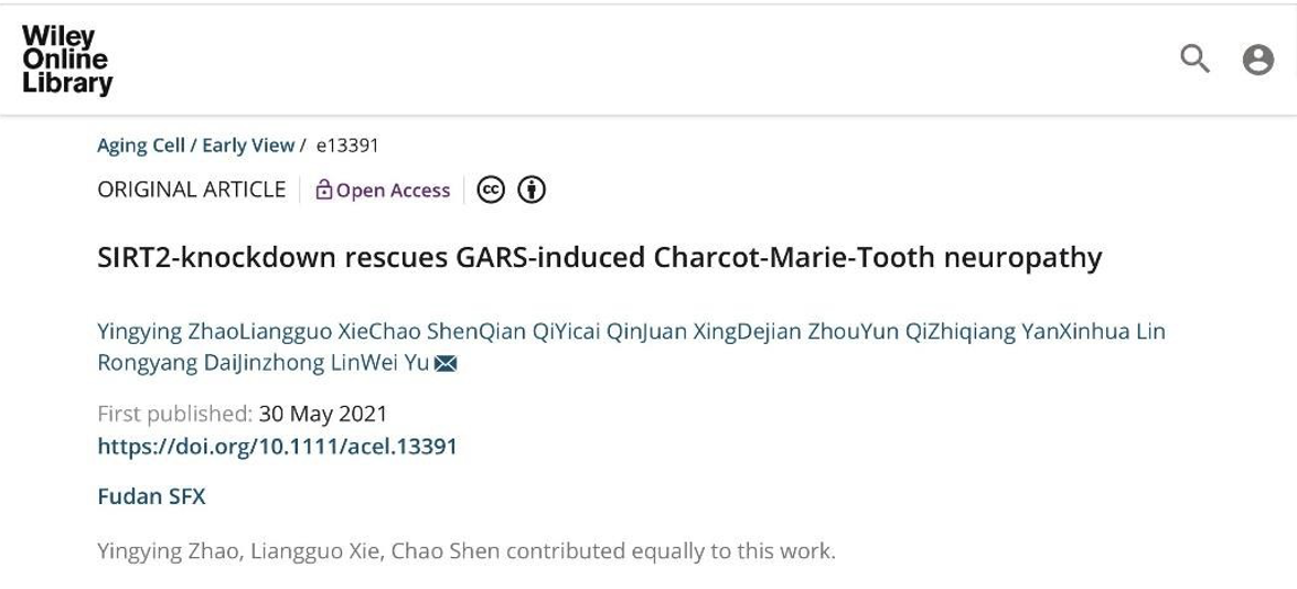 2021 年 5 月 30 日,我室余巍课题组在 Aging Cell 在线发表文章 SIRT2- knockdown Rescues GARS-induced Charcot-Marie-Tooth Neuropathy,发现敲低衰老基因 SIRT2 可以挽救 GARS 突变诱导的 CMT 疾病。