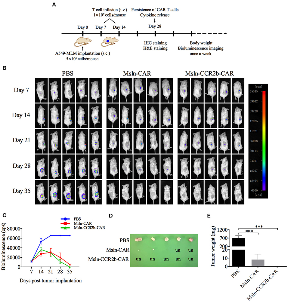 图2. NSG小鼠肺癌CDX模型中,CCR2b增强了Msln-CAR T细胞抗肿瘤作用