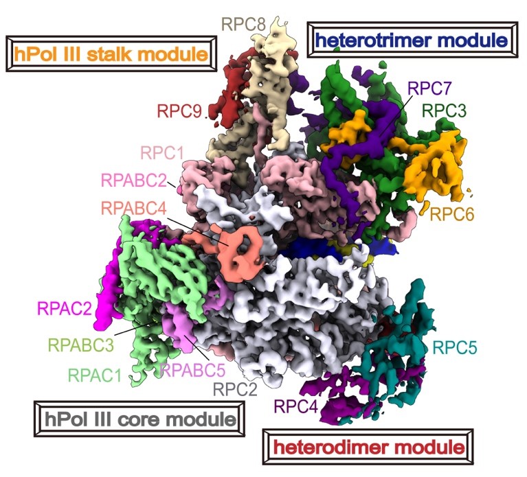 在真核生物中,三种结构保守的RNA聚合酶(Pol I,Pol II和 Pol IIII)分别介导不同基因的转录,合成不同类型的RNA。Pol I 定位在细胞核核仁中,主要转录rRNA;Pol II、Pol III均位于细胞核核质中,其中Pol II负责转录合成mRNA, Pol III负责转录合成tRNA、5S rRNA、U6 RNA等其他非编码小RNA。Pol III是真核生物中组成最为复杂的聚合酶,包含17个亚基,可分为结构保守的催化核心模块和外周调控模块。临床试验证明,Pol III的突变和异常组装会导致特雷彻·柯林斯综合征、异染性脑白质营养不良、贝克威斯韦德曼氏症等疾病的发生。