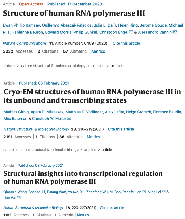 在此研究论文审稿过程中,国际上有三个研究小组(上图)发表了关于人源Pol III的研究工作,基本结构模型相似,但着重点各有不同,从多个角度共同揭示了人源Pol III的结构特征以及可能的转录调控机制。