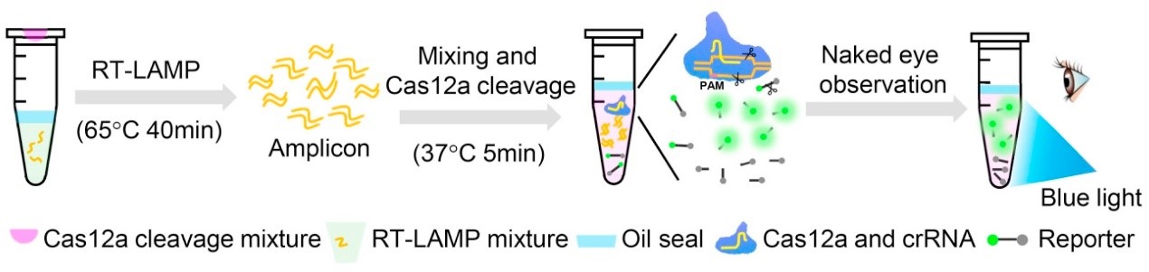 2020年10月26日,王永明团队、倪挺团队、郑琰团队联合杭州市第一人民医院在国际著名杂志《Biosensors and Bioelectronics》在线发表了 题为“opvCRISPR: One-pot visual RT-LAMP-CRISPR platform for SARS-cov-2 detection”的文章。研究者开发出了一套名为“ opvCRISPR”的新型冠状病毒检测系统,具有检测时间短、灵敏度高、结果可视化的特点。作者将逆转录环介导等温扩增技术(RT-LAMP)及Cas12a剪切整合到一个系统中,能够在45分钟内检测接近单个分子的样本,诊断结果与实时定量RT-PCR测定结果一致性(图1-2)。