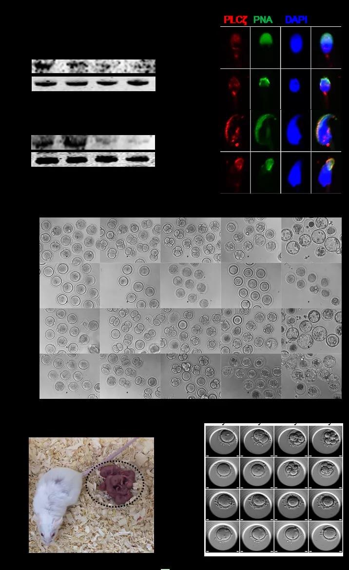 进一步的研究发现,ACTL7A突变导致顶体缺陷,会引起精子卵母细胞激活因子(Sperm Oocyte Activation Factor, SOAF)PLCζ表达降低,并且定位在与卵子首次融合并释放SOAF的精子赤道区的信号消失(图3)。所以,ACTL7A突变导致顶体缺陷,从而引起PLCζ表达量和分布的改变是早期胚胎发育失败的原因。基于以上基础,研究人员利用氯化锶(SrCl2)进行了ICSI-AOA,可成功使得突变小鼠精子与卵子受精并发育成囊胚,经胚胎移植后生育健康子代(图3)。为未来在ART过程中开展此类患者的临床治疗奠定了基础。