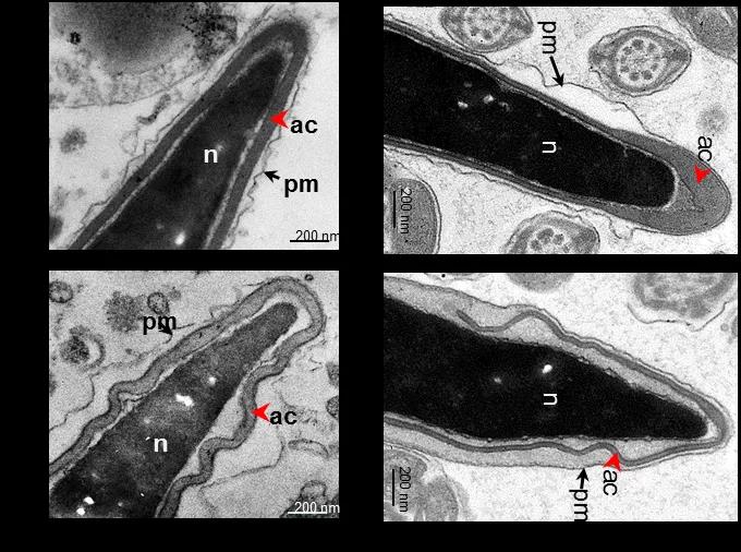 研究人员遂利用基因编辑技术建立了与患者一致的Actl7a点突变小鼠模型,发现该基因的突变不影响雄性小鼠的精子密度、活力及生殖系统的发育,只表现为雄性不育。经透射电镜对精子进一步分析发现,患者和突变小鼠的精子顶体都呈现褶皱脱落的形式,无法贴合在精子细胞核膜上,表现为顶体超微结构缺陷(图2)。