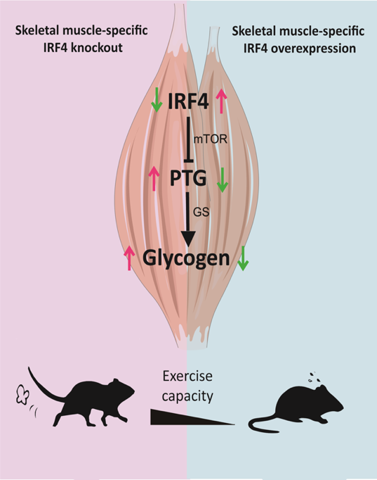 本研究首次揭示IRF4是机体骨骼肌运动代谢适应的信号节点,可通过激活下游靶蛋白PTG促进骨骼肌糖原合成的重新编程、调节运动能力。已知运动在防治代谢性疾病方面的众多益处,然而确定模拟或促进耐力训练的药物分子靶点一直以来都是较难实现的医学目标。该研究初步表明IRF4在调节骨骼肌能量代谢方面具有重要作用,有助于从分子水平理解运动时机体调节能量代谢的具体制,同时为防治慢性代谢疾病提供新的思路。