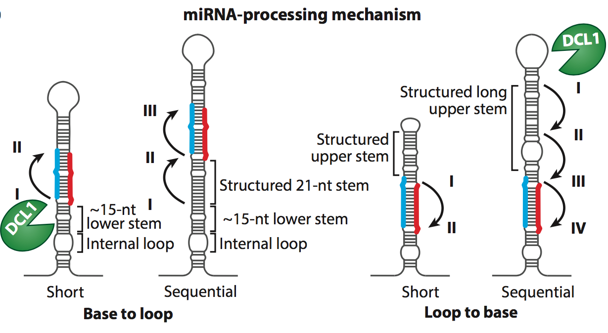 图1、植物miRNA的两种加工机制(Bologna and Voinnet, 2014 )