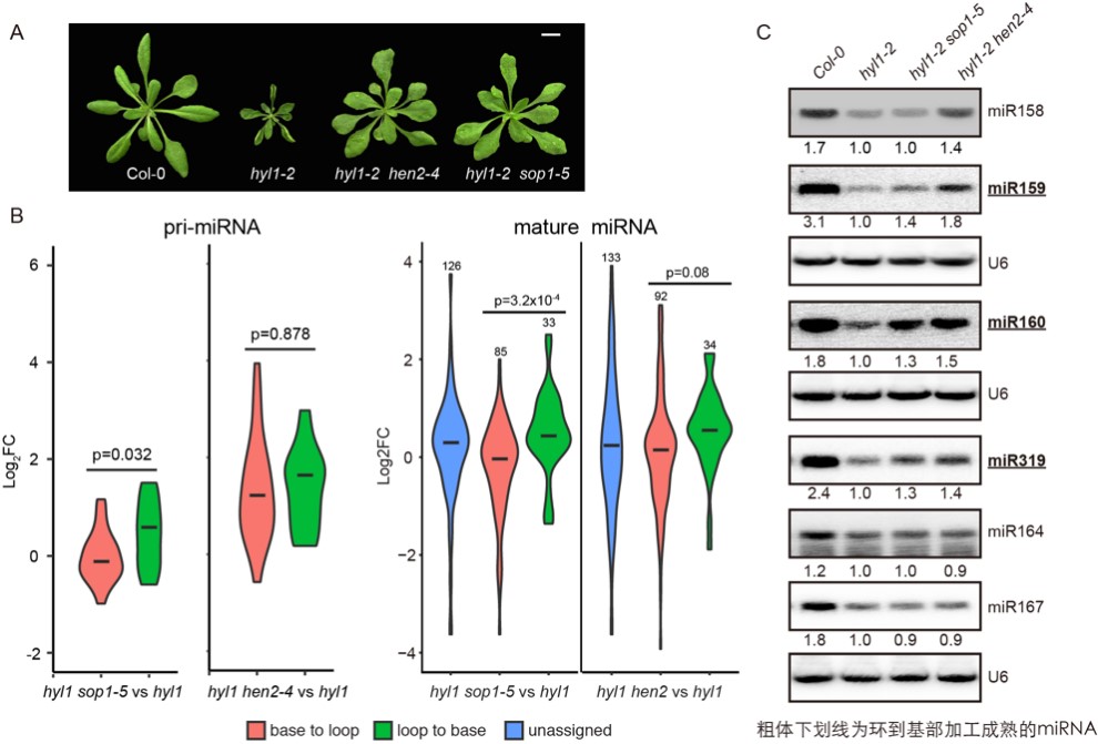 该研究通过正向遗传学筛选hyl1-2的表型抑制子,结合图位克隆分离鉴定到核质外切体的另一辅助因子SOP1。SOP1蛋白C端含有5个串联的CCCH型锌指结构,可能与RNA结合有关。SOP1与HEN2共定位,参与部分核质外切体靶标RNA的降解。在hyl1-2中引入HEN2的突变同样可以显著抑制hyl1-2的发育缺陷,表明SOP1和HEN2很可能是通过外切体途径参与miRNA调控的 (图2A)。通过对miRNA以及pri-miRNA的联合分析发现,hyl1 sop1 双突变体中加工方向为环到基部的pri-miRNA较hyl1有更高的积累,对应成熟miRNA表达水平得到了显著回复,表明SOP1选择性参与hyl1突变体中加工方向为环到基部的pri-miRNA降解(图2B&C)。令人惊讶的是,hyl1 hen2双突变体中几乎所有的pri-miRNA均显著累积,但是只有环到基部成熟的miRNA得到了回复(图2B&C)。该研究结果表明当HYL1缺失时,环到基部加工的pri-miRNA的更多累积可以促进miRNA的生成,而基部到环加工的pri-miRNA则不能。加工复合体成员SE能够与HEN2相互作用,猜测可能在招募外切体中发挥功能。