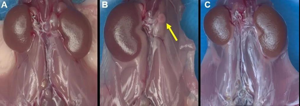 图2. 正常小鼠的肾脏(A)和Tbx6 基因突变小鼠的孤立肾(B)和肾脏发育不全表型(C)