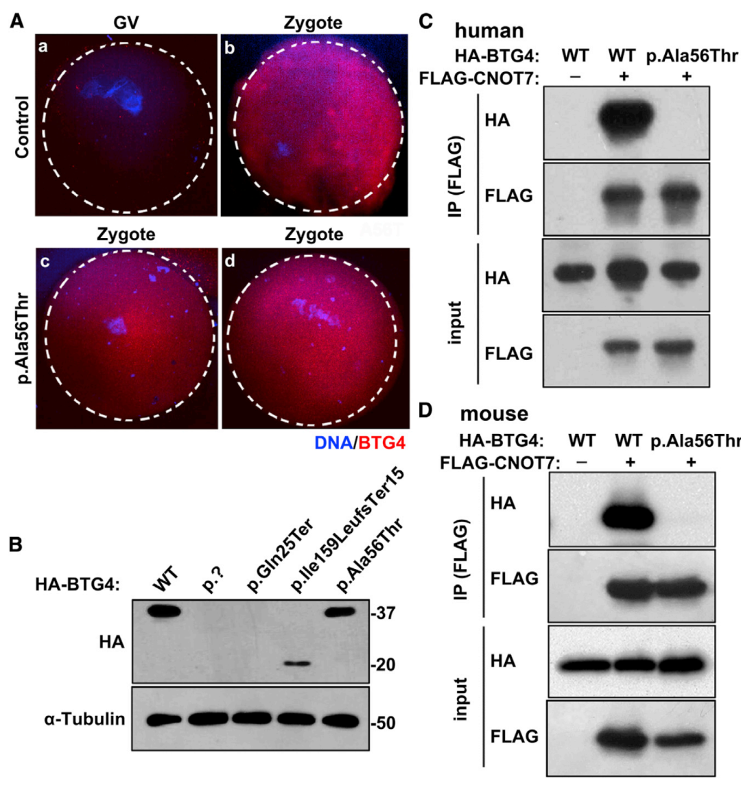 已有研究显示,BTG4蛋白可以招募CNOT7调控母源mRNA降解,其在母源合子转换过程中发挥重要功能。体外研究显示,三个功能丧失性突变均导致正常BTG4蛋白的表达完全缺失,纯合错义突变(p.Ala56Thr)虽然不影响BTG4蛋白的正常表达以及其在患者合子中的表达与分布,但使得BTG4蛋白与CNOT7的相互作用完全丧失(图2)。随后通过对患者合子进行RNA-seq分析发现,患者合子中有大量母源性mRNA的累积,进一步说明BTG4突变导致患者合子中的母源mRNA降解发生异常。另外,通过对比合子中oligo(dT)和随机引物反转录产物中相关基因表达量的比值显示,患者合子中该比值显著高于对照组,间接说明BTG4突变影响了患者合子中母源mRNA的去腺苷化,进而导致大量母源mRNA未被正常降解,最终导致合子分裂失败。