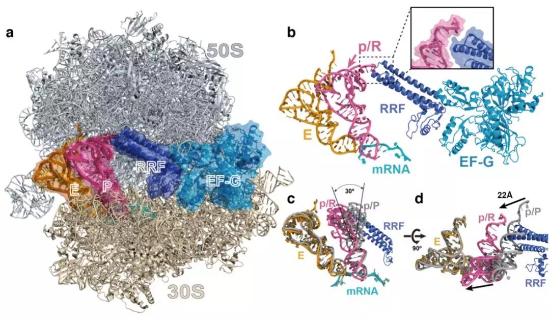 核糖体在翻译mRNA遇到终止密码子即预示着这条mRNA编码的蛋白质已经合成完毕,在释放新生肽链后,核糖体需要重新解聚为大小亚基参与其他mRNA的翻译。这个再循环过程需要两个保守的蛋白质因子: 延伸因子G(Elongation Factor G)和核糖体回收因子RRF的参与。作为原核核糖体领域几个悬而未决的重要问题之一,这一过程的分子机制一直没能被完全阐明。
